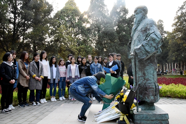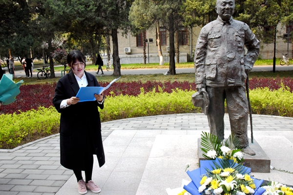 活动中,本科生党员代表张丽芸介绍了于右任、辛树枳老一辈先贤情系农业、扎根杨凌、创建西农(原西北农林专科学校)的艰辛历程,讴歌先贤前辈勇于担当民族使命、胸怀国家苍生为农业事业艰苦奋斗、无私奉献的伟大精神。本科生党员代表严俊、研究生党员代表马震珠为于右任和辛树枳先生献上鲜花。全体党员为先贤前辈默哀三分钟并三鞠躬以敬先贤并寄哀思。